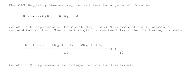 有時(shí)一些物質(zhì)很難尋找,只有一個(gè)CAS參考,然而數(shù)據(jù)庫(kù)檢索不到CAS信息,那么這時(shí)可以檢驗(yàn)查找到的CAS是否正確。CAS就像每個(gè)化學(xué)物質(zhì)的身份證號(hào)碼一樣,CAS 最多包含 10 位數(shù)字,由連字符分成 3 組。 數(shù)字的第一部分,從左邊開始,有 2 到 7 位數(shù)字; 第二部分有2位數(shù)字, 最后一部分由一個(gè)校驗(yàn)碼組成,校驗(yàn)碼由前面兩部分計(jì)算得到。計(jì)算公式如下: