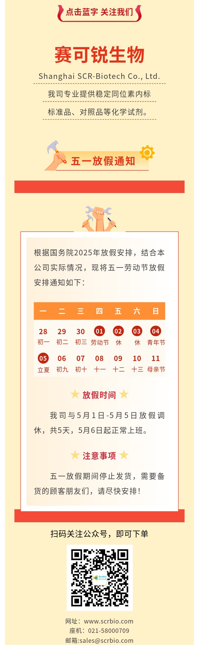 上海賽可銳(Shanghai SCR-Biotech Co., Ltd.)五一放假通知!